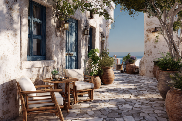 רהיטים מעץ טבעי וצמחייה ים־תיכונית