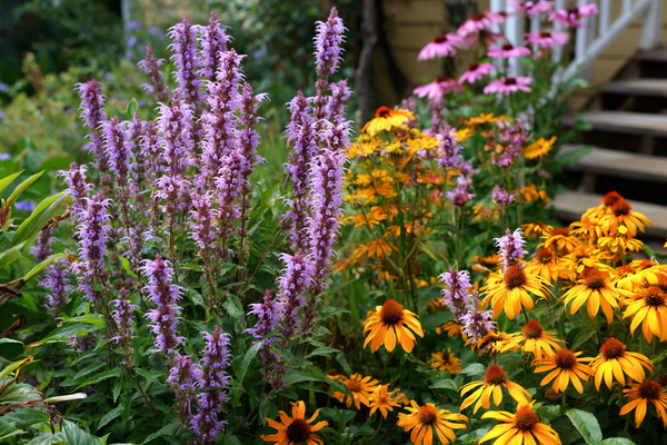 אגסטאשה (Agastache foeniculum) היא צמח מרפא עם פריחה סגלגלה וריח מנטולי עדין. היא מתאימה במיוחד לחום ויובש, ונראית נהדר לצד האכינצאה. שתיהן יוצרות יחד גינה שופעת פריחה ומושכות מאביקים, מבלי לדרוש תחזוקה יומיומית.