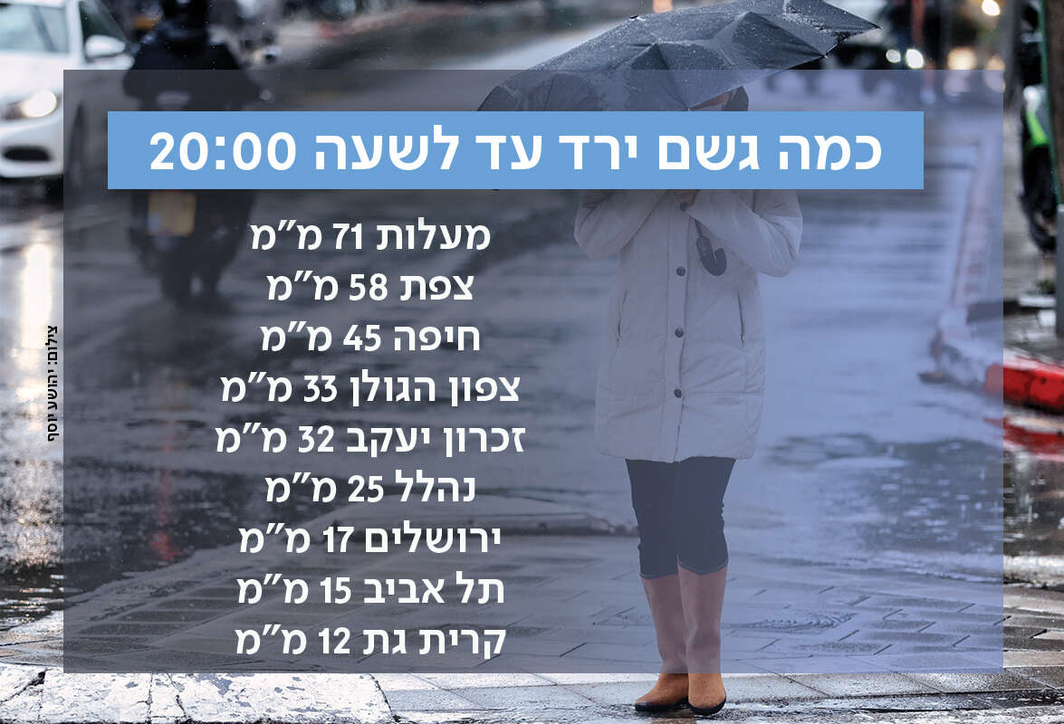 ביום שני גשמים יירדו מידי פעם מצפון הארץ ועד לצפון הנגב, קיים חשש לשיטפונות במקומות המועדים, בחרמון יירד שלג וייתכן גם בצפון הגולן, קר מהרגיל.