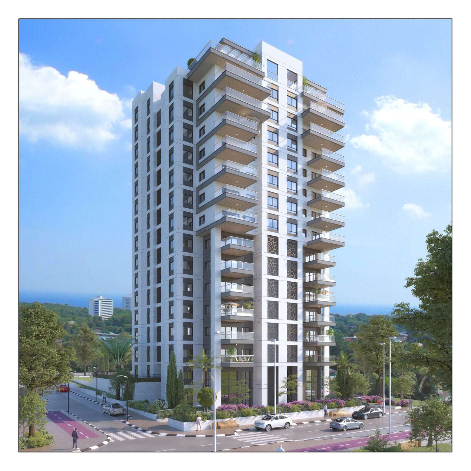 לדברי אמרוסי, מעבר למיקום הייחודי של המגדל בין כביש 2 לחוף הים, עם גישה מהירה ונוחה לכניסות ויציאות מהעיר, מעל פארק איינשטיין וליד מוסדות חינוך מבוקשים - מדובר בתכנון ובנייה עם חשיבה על כל פרט, לנוחות והנאת הדיירים: "מהלובי המפואר ומועדון הדיירים הענק, מחדר כושר מאובזר ועד הדירות עצמן, עיצוב ארכיטקטוני עכשווי עם חיפוי אלומיניום יוקרתי, מבחינים כי הפרויקט מציב רף חדש של סטנדרטים באזור", מדגיש אמרוסי.