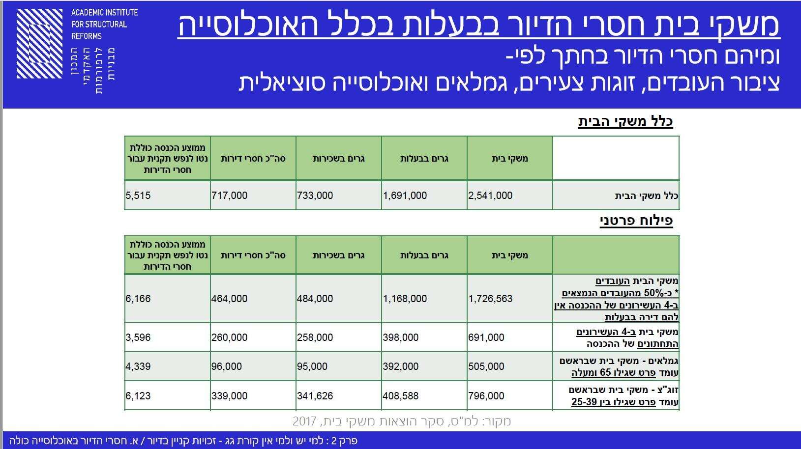 יותר מ-730,000 משקי בית, יחידים ומשפחות המתגוררים בכל רחבי הארץ, שהם על פי נתוני הלשכה המרכזית לסטטיסטיקה משנת 2017 כ-2.5 מיליון אזרחים, ביניהם כמיליון ילדים, מוגדרים כחסרי דיור בבעלות.