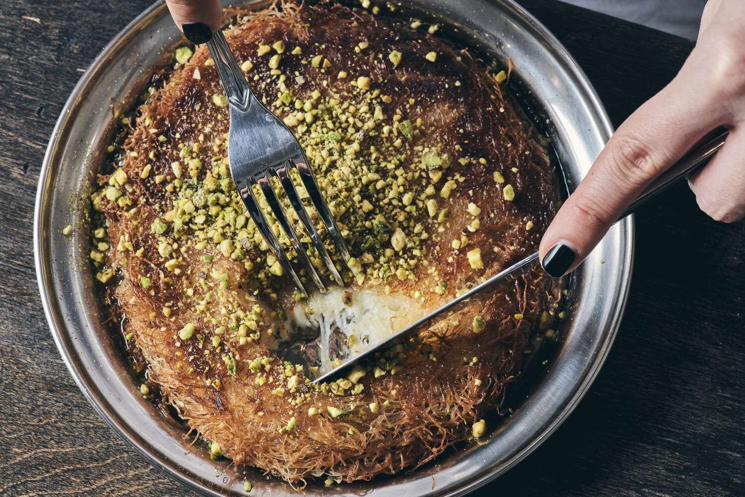 לקינוח אפשר לקבל את הכנאפה של ביגה, שערות קדאיף עם תערובת גבינת חמד וגבינה לבנה ברוטב הדרים.